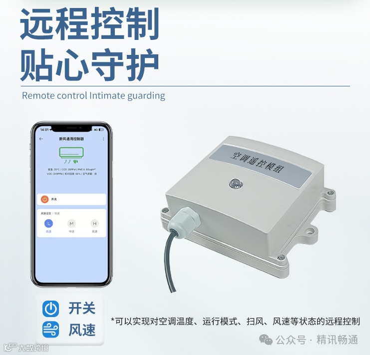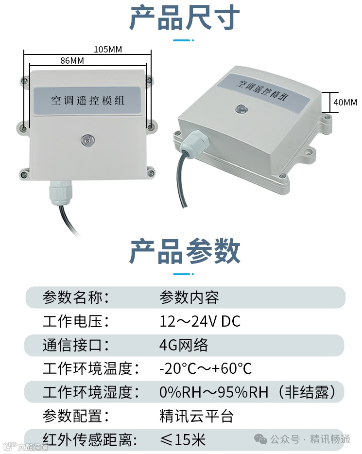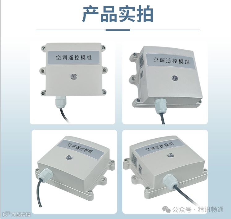 本产品是精讯畅通研发的一款4G空调遥控模组,可通过接收红外码,实现对空调的控制。带有自动控制功能,可通过APP自动控制周期内空调的启停。设备数据可上传至我公司免费的云平台,通过网页、手机APP可远程查看空调实时状态,进行远程控制。