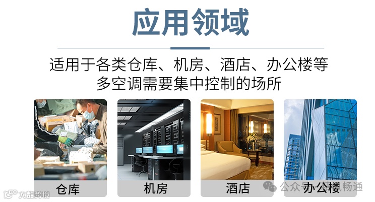 适用于各类仓库、机房、酒店、办公楼等多空调需要集中控制的场所。