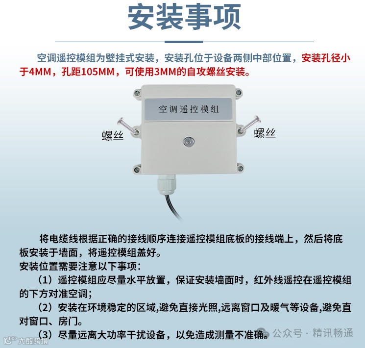 家中空调可以使用遥控器或者具备红外功能的智能手机进行遥控,但工业生产与农业生产过程中可能出现人员不方便到场遥控空调的情况,如无人车间、无尘车间禁止外来人员进入,农业大棚或畜棚距离管理人员居住地太远、管理人员难以在第一时间到达现场,机房仓库等特定环境需要实时进行温度调节、而管理人员不能随时在场等等。