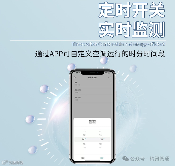 2. 定时开关,实时监测。通过APP可自定义空调运行的时长与时间段。