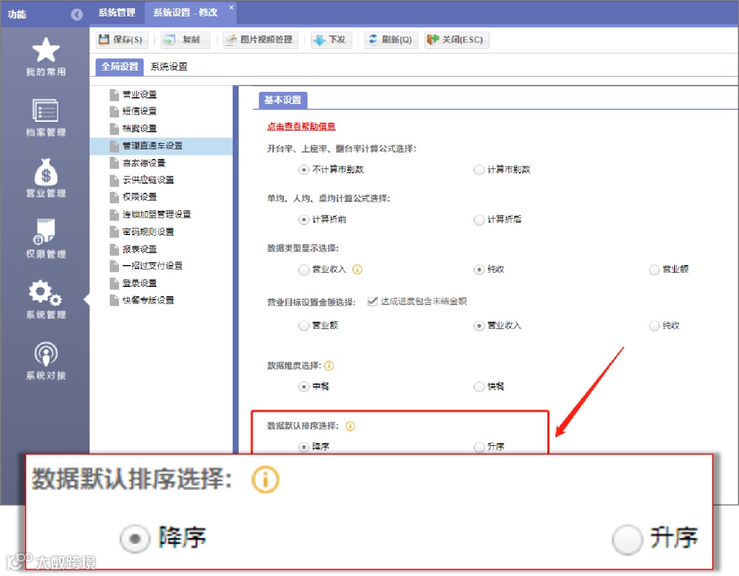 餐饮总部后台-管理直通车设置-数据默认排序选择:降序、升序,设置后报表的默认排序方式会随之变化。