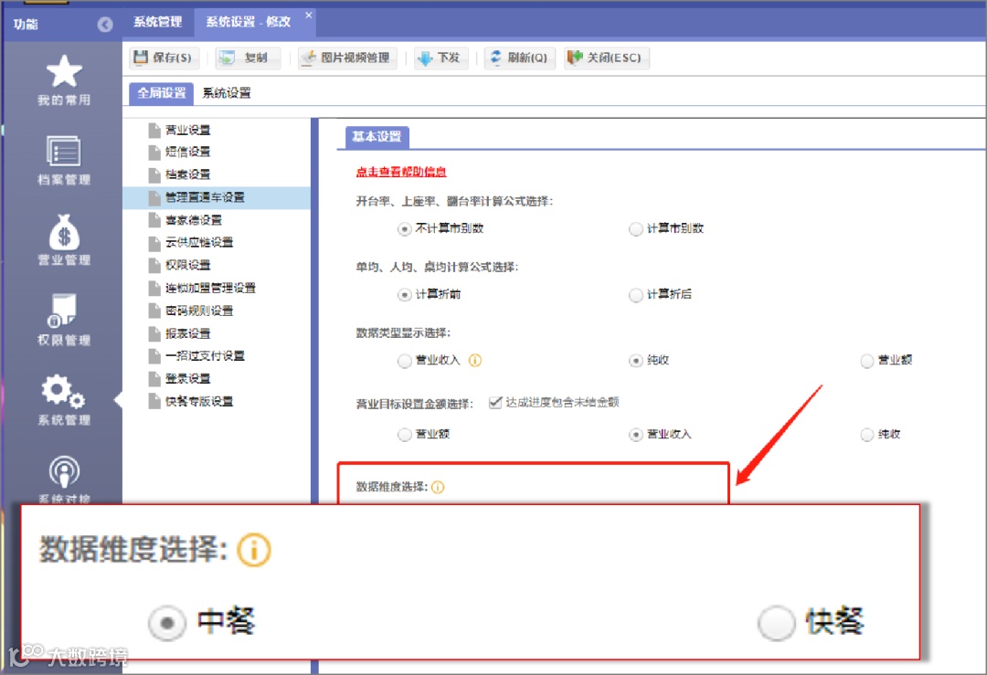 餐饮总部后台设置-管理直通车设置-数据维度选择:中餐或快餐,设置快餐后,隐藏中餐客位、人数等相关数据。