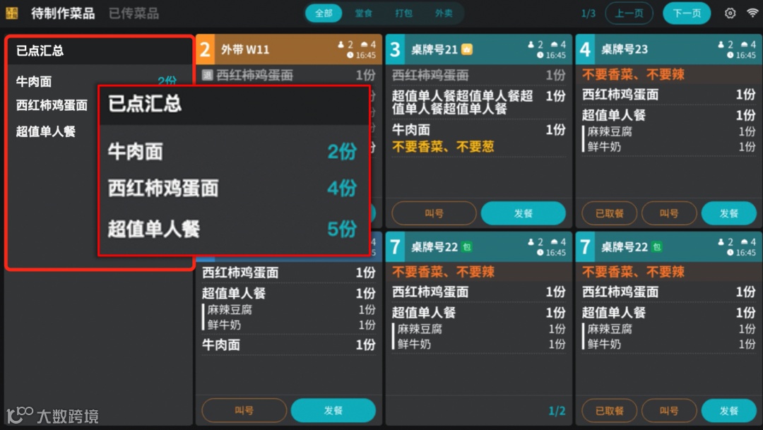 当厨房需要看现存单据菜品总数时,可通过已点汇总列表直观看到待做菜品数量,合并同规格菜品以便厨师在制作的时候可批量出餐,节约原材料和时间成本。