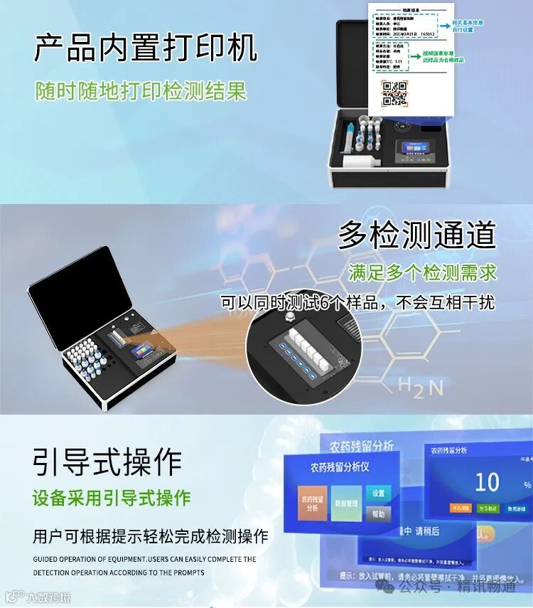 农药残留检测仪采用酶抑制法和光电比色法对有机磷和氨基甲酸类农药进行监测,设备可连接物联网云平台,数据实时上传至监管平台,工作人员可远程进行查看。