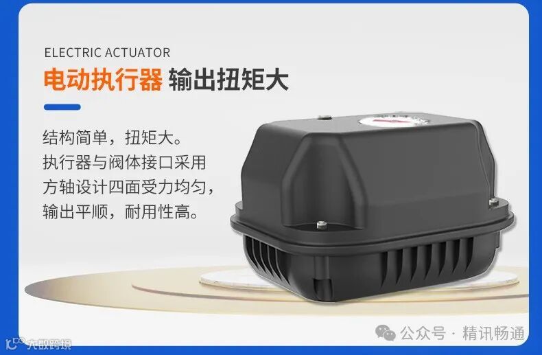 3. 电动执行器,输出扭矩大。结构简单、扭矩大,执行器与阀体接口采用方轴设计,受力均匀、输出平顺,耐用性高。