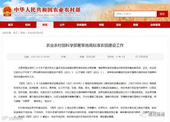为了进一步推进旱地高标准农田建设工作,确保高标准农田建设任务保质保量如期完成,农业农村部办公厅印发了《旱地高标准农田建设技术规范(试行)》指导各地统筹做好在缺乏灌溉水源的地区开展高标准农田建设有关工作。