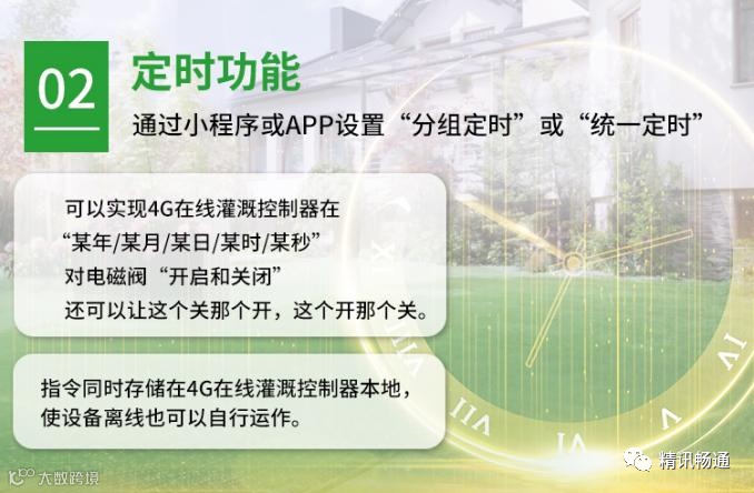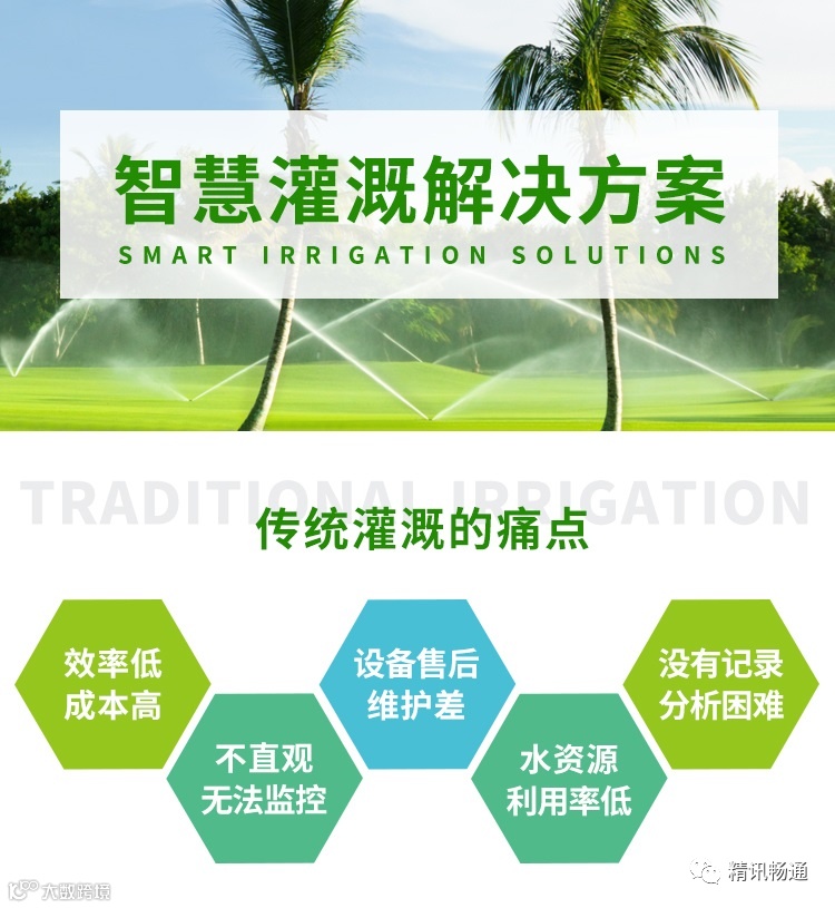 智慧农业解决方案中包含智慧灌溉系统,智慧灌溉系统由多种传感器和智能灌溉设备组合而成,集成远程控制、精准灌溉、精准排水、流量监控等功能,可按用户需求制定灌溉计划。传感器可侦测土壤、水肥等信息,经由精讯云平台与其他农机相连,一旦监控到异常数据,就会向灌溉设备下达指令进行灌溉,灌溉过程可实时监控,节省水量,提升灌溉效率。