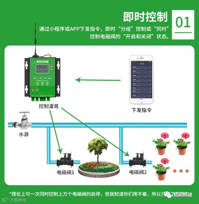 灌溉控制器是智能灌溉系统的中枢设备,该设备可通过无线传输芯片接收和输出数据信号,因此可接受手机、电脑的远程管理;用户通过使用手机或电脑,向灌溉控制器下达指令,灌溉控制器就会向灌溉管道上的电磁阀发射电信号或红外信号,电磁阀接收信号后,就会开阀放水或闭阀停水,以实现灌溉活动的执行和终止。