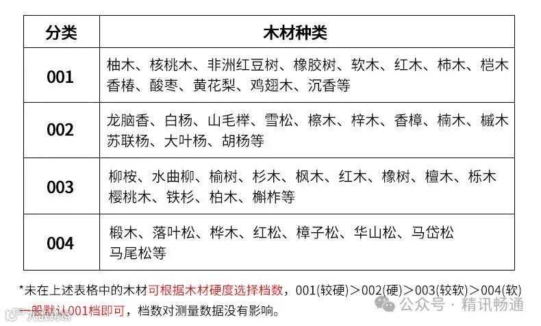 1.测量树种,类别显示。4种测量模式,可根据木材硬度选择档数,通过001(较硬)/002(硬)/003(较软)/004(软)方式呈现,数据测量准确稳定。
