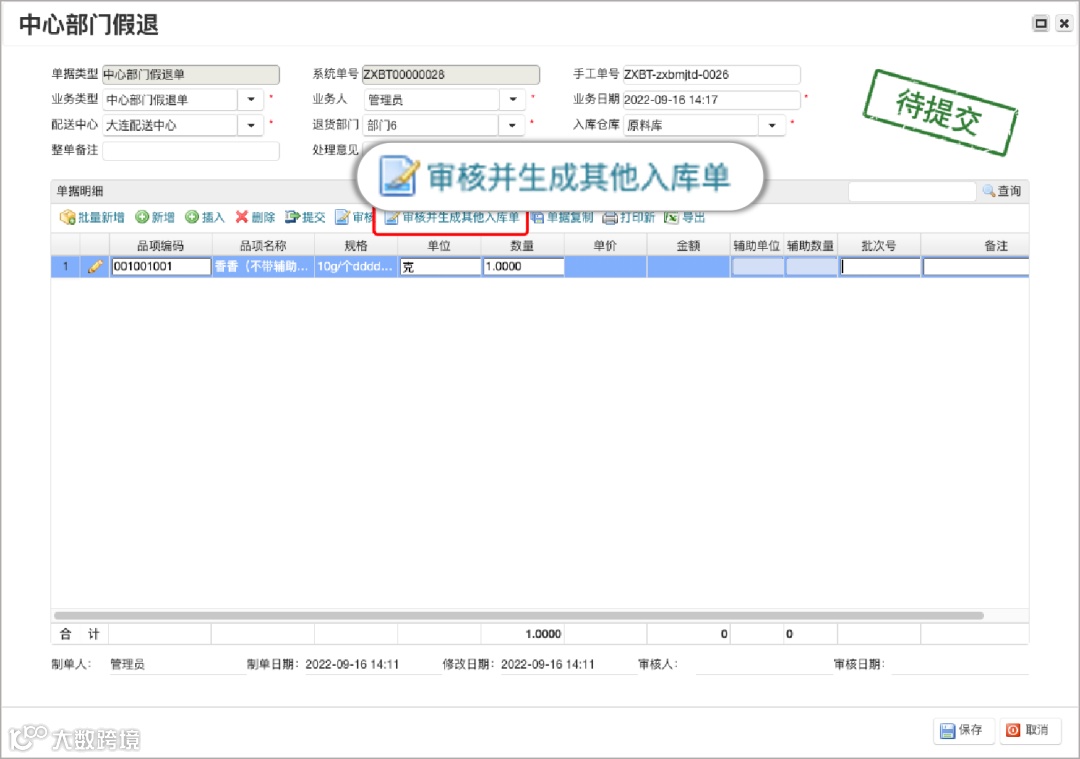 中心部门假退单,单据审核前,可以看到审核并生成其他入库单按钮,点击后审核假退单并自动生成已审核的其他入库单