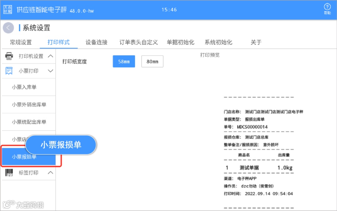门店在电子秤上完成报损出库单或店间调拨单的称重后,点击单据上的打印按钮,可以直接打印出小票,小票的样式可以在设置中预览,也可调整小票宽度,目前支持58mm和80mm两种;