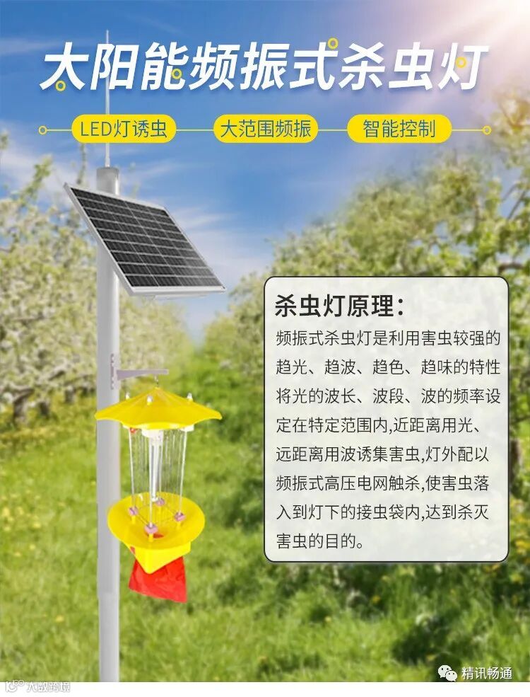 频振式杀虫灯是利用害虫较强的趋光、趋波、趋色、趋性信息的特性,将光的波长、波段、波的频率设定在特定范围内,近距离用光、远距离用波诱集害虫,灯外配以频振式高压电网对害虫进行触杀,并使害虫尸体落入到灯下的接虫袋内,达到杀虫灭虫的目的。