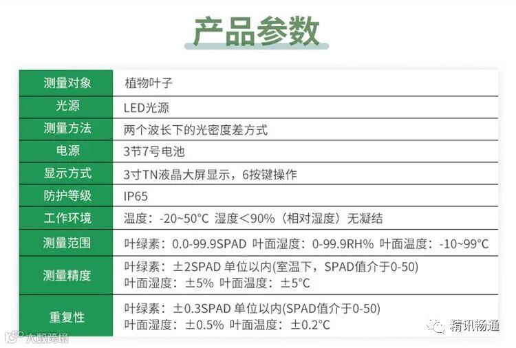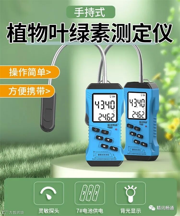 精讯畅通推出的这款叶绿素测定仪采用2个不同波长的光源分别照射植物叶片表面,通过比较穿过叶片的透射光的光密度差异而得出SPAD值,以及叶片绿色程度、叶面湿度、叶面温度等数据,从而了解植物真实的硝基需要量,并且帮助使用者了解土壤硝基的缺乏程度等问题。