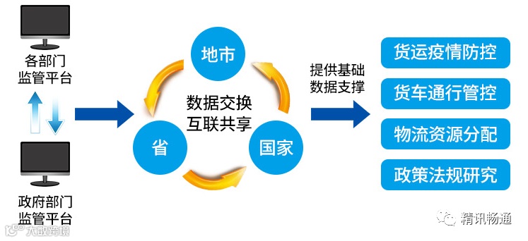 平台可与各部门监管平台实现数据互通,并同当地其他政府部门相关监管平台对接。还可根据需求,实现不同监管平台之间的数据交换、互联共享,实现地市、省、国家三级平台联网联控。平台输出的相关数据,可为货运疫情防控、货车通行管控、物流资源分配、政策法规研究提供基础数据支撑。