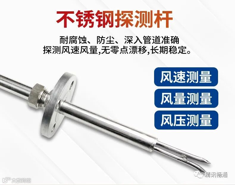 3. 不锈钢探测杆。耐腐蚀、防尘效果卓越,可深入管道准确测量风速风量,无零点漂移,长期稳定。