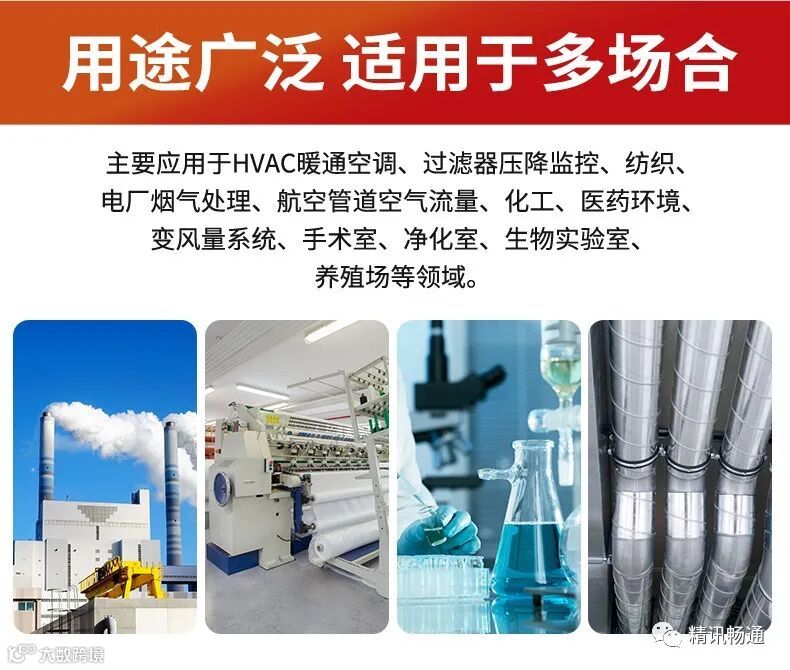 主要应用于HVAC暖通空调、过滤器压降监控、纺织电厂烟气处理、航空管道空气流量、化工、医药环境、变风量系统、手术室、净化室、生物实验室、养殖场等领域。