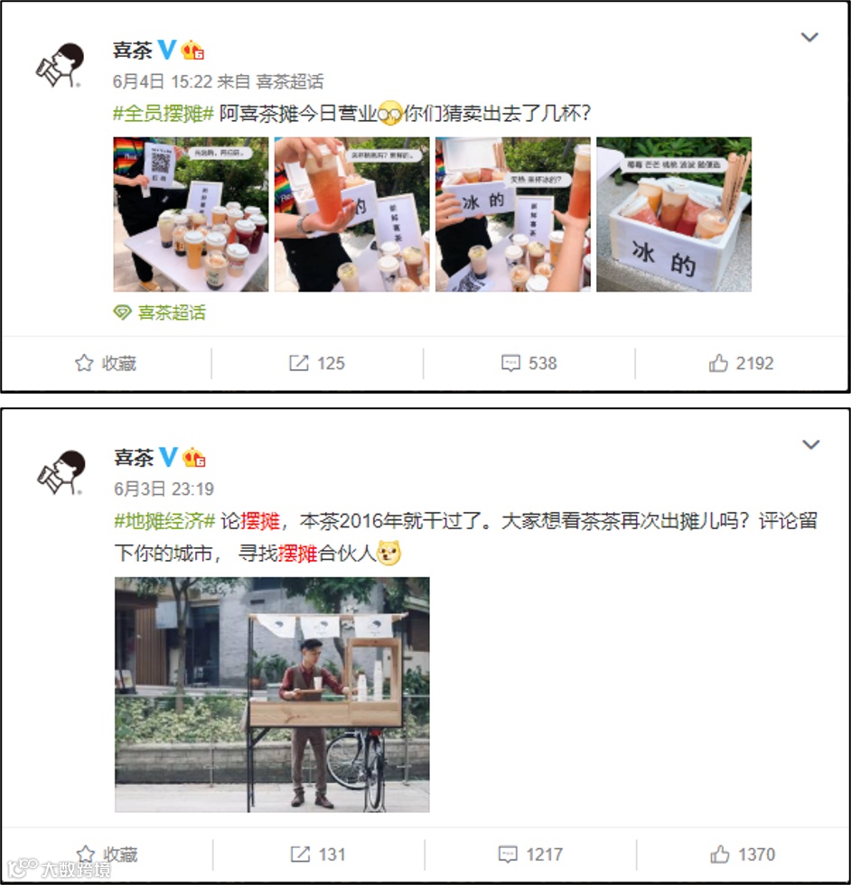 ■ 喜茶:在微博上征集了“摆摊合伙人”,并官宣阿喜茶摊开始营业,先选购再扫码付款;
