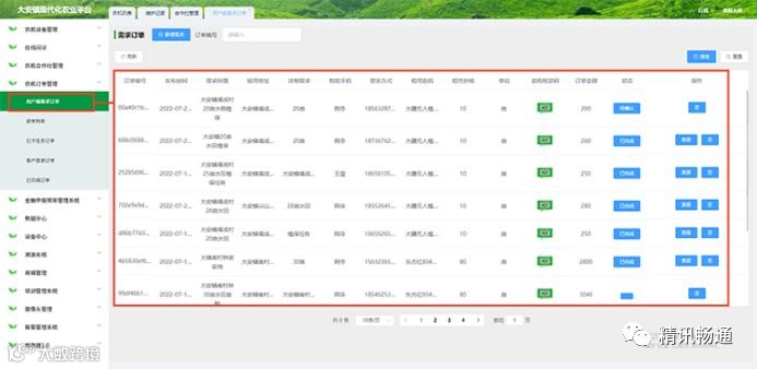 用户端需求订单页面显示用户提交农机使用订单的相关情况,包括订单编号、使用地址、联系人、联系方式、租赁农机、租赁价格、农机收款码在内的11项重要信息一目了然。