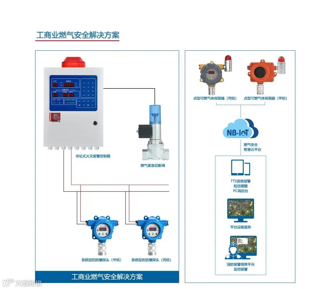 此外可燃气体探测器支持有源信号输出,配接现场燃气专用切断阀。当现场出现可燃气体报警时,输出控制信号控制机械手切断燃气管道,实现报警断气,控制火灾的发生。