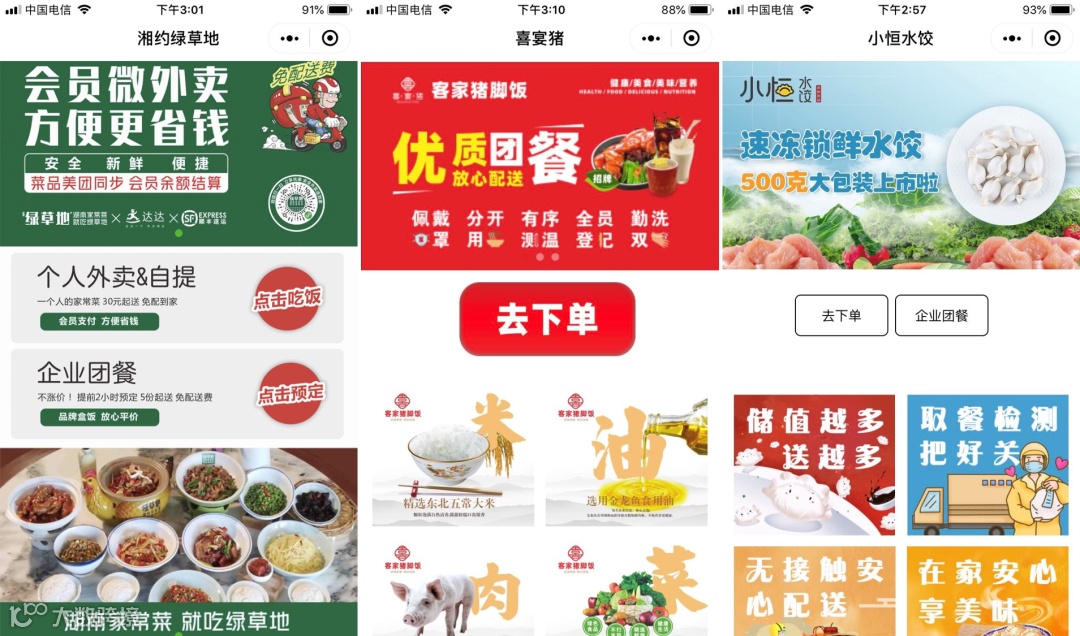 湘约绿草地、小恒水饺等餐饮品牌纷纷在自营外卖小程序上开展“企业团餐“版块,取得了不错的营收成绩。