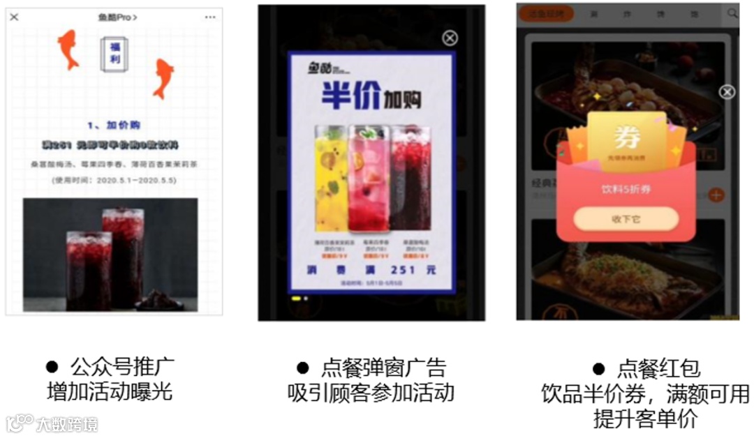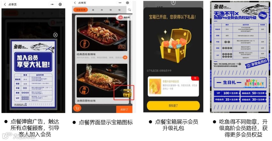 餐饮品牌“鱼酷Pro”通过在点餐小程序上设置“吃鱼得勋章,累积勋章会员升级路径、开启宝箱得礼包“等营销活动,不仅打造了更有品牌记忆点的营销花样玩法,提升了顾客体验,更为餐厅提高了门店会员转化率,沉淀了更多的私域流量。