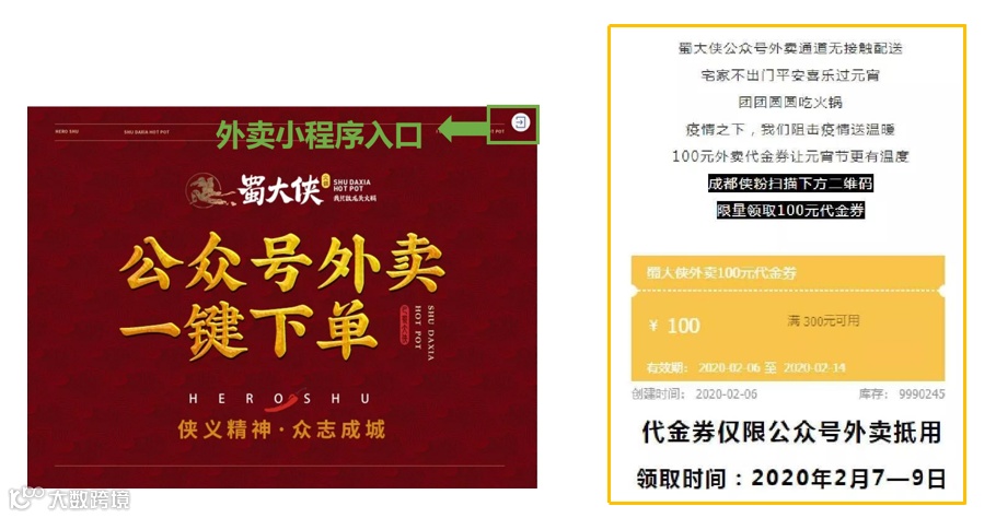 蜀大侠借助天财商龙小程序开展自营外卖+自提业务,在疫情期间就做到了单天外卖营业额达到疫情之前门店营业额的1/3,并且通过推出自营外卖专属代金券,不仅让关注蜀大侠的铁粉享受到了独有的福利,也借此机会吸引粉丝转发,从而为企业带来更多的流量。