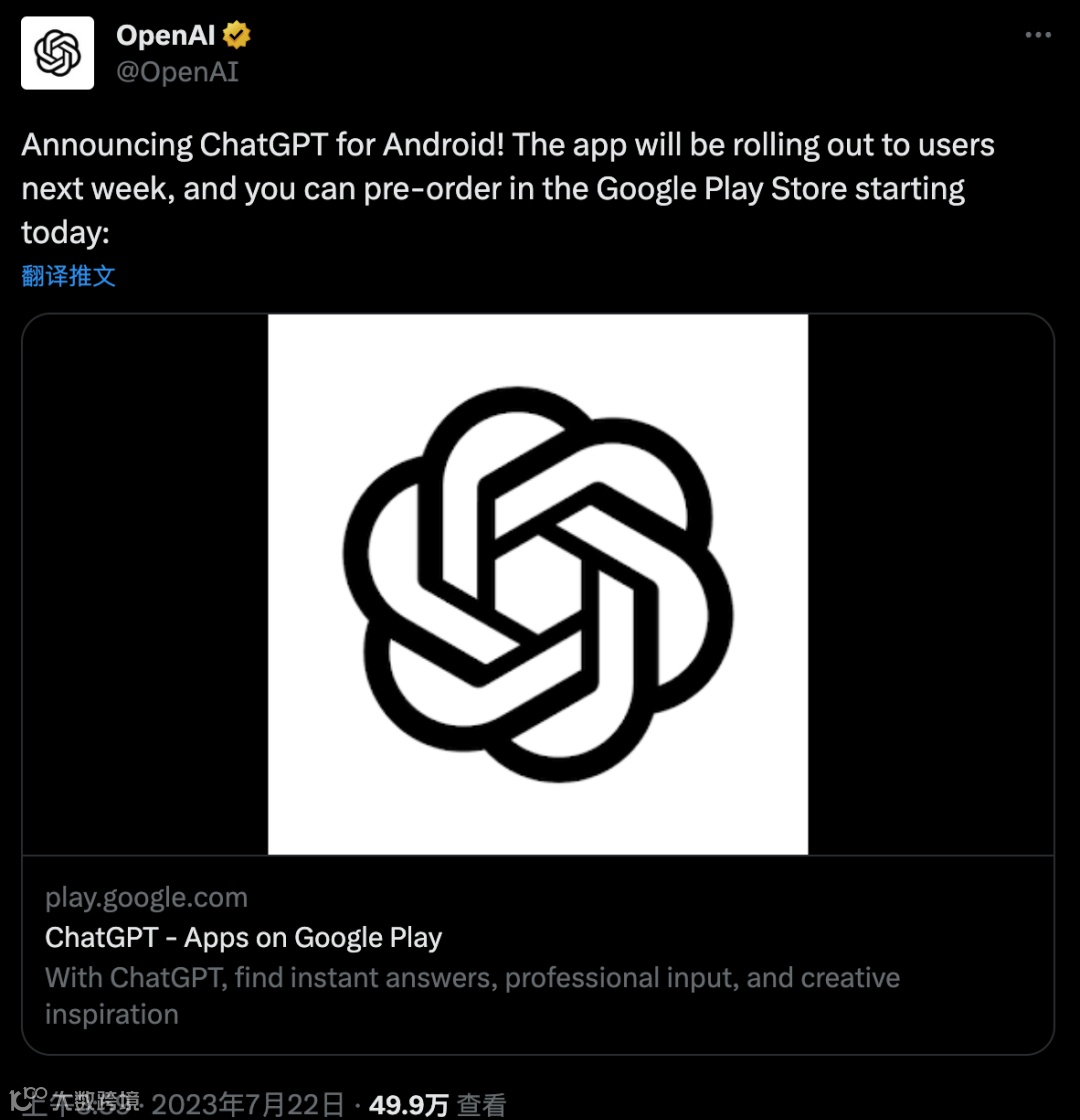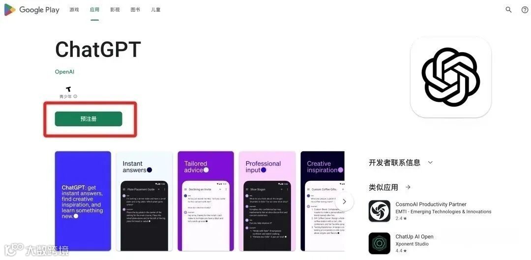 目前,我们只能通过“预订”功能来体验OpenAI的安卓版ChatGPT。跳转至Google Play的应用页面,登录谷歌账号并点击“预订”,我们就可以第一时间收到发布通知了。