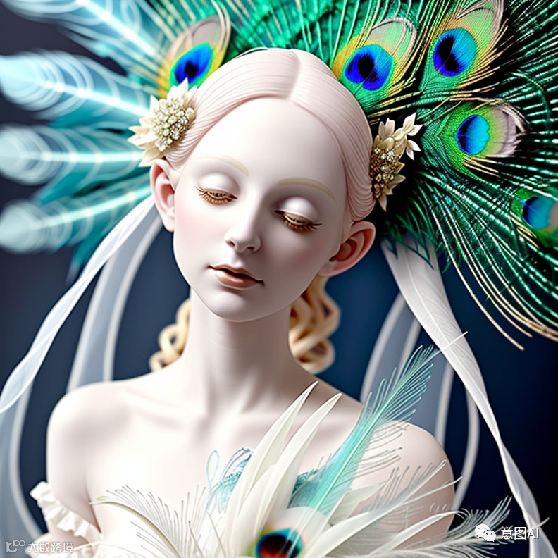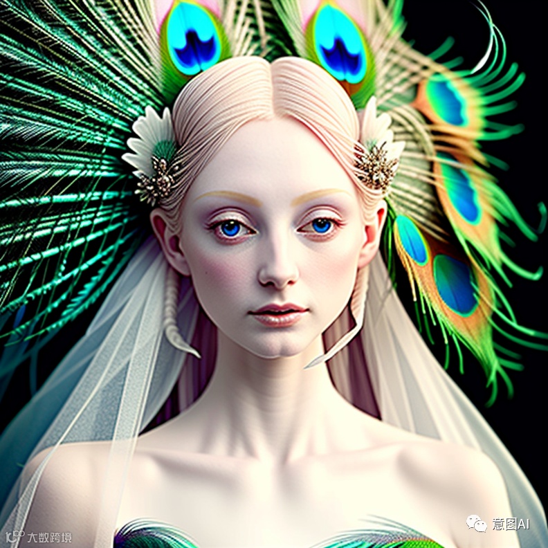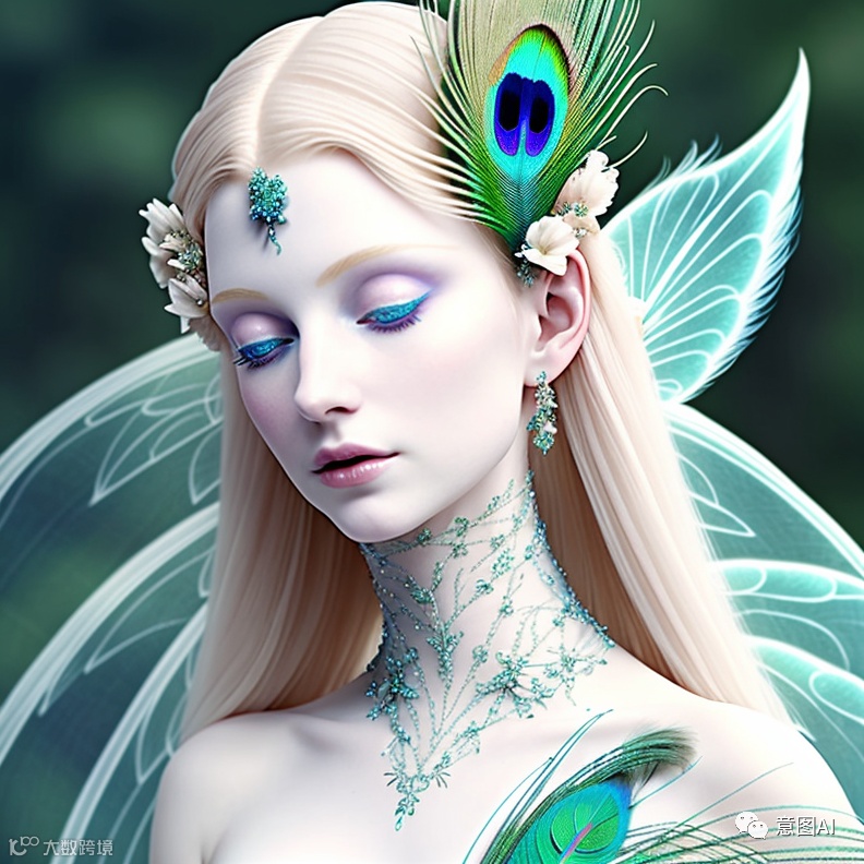 孔雀公主关键词:Ethereal, pale skinned fairy goddess with a flowing gown and peacock feathers, closeup