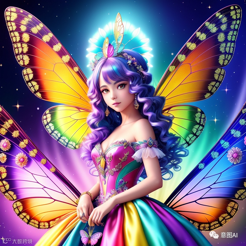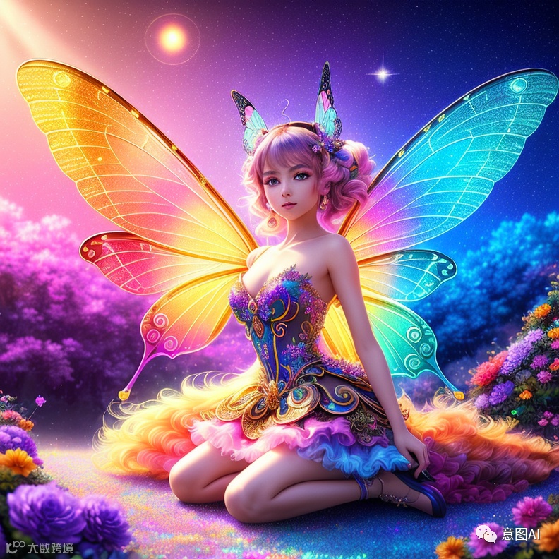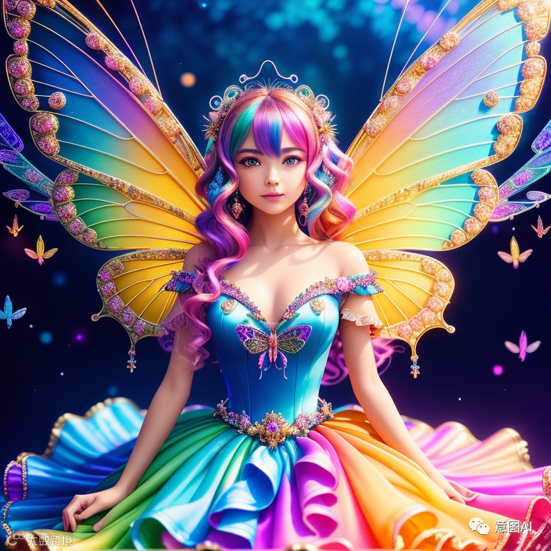 蝴蝶仙子关键词:WLOP, masterpiece best quality hyperdetailed breathtaking colorful glamorous scenic view medium-portrait of 1 faerie girl anime kneeling in the fantasy glowing forest, hopefu petite young small body, glamorous off the shoulder faerie dress, hyperdetailed intricate flying fluffy hair, stray hairs, glamorous symmetrical colorful dragonfly wing, glamorous colorful diamond heel, glamorous colorful beautiful detailed fluffy vein dress, beautiful detailed face, hyperdetailed complex, hopeful, windy, glamorous sky, colorful glowing glamour sunshine, intricate glowing glamour colorful light reflection, a lot of hyperdetailed colorful glamorous tiny butterfly floating in the air, glamorous beautiful detailed shading, cinematic light, studio lightning, back light, volumetric lighting maximalist photo illustration 8k, resolution high res intricately detailed complex, glamourous, key visual, vibrant, precise lineart, panoramic, cinematic, masterfully crafted, 8K resolution, beautiful, stunning, ultra detailed, expressive, vibriant color, hypermaximalist, colorful, rich deep color, vintage show promotional poster, glamour, brush strokes, UHD, HDR, UHD render,