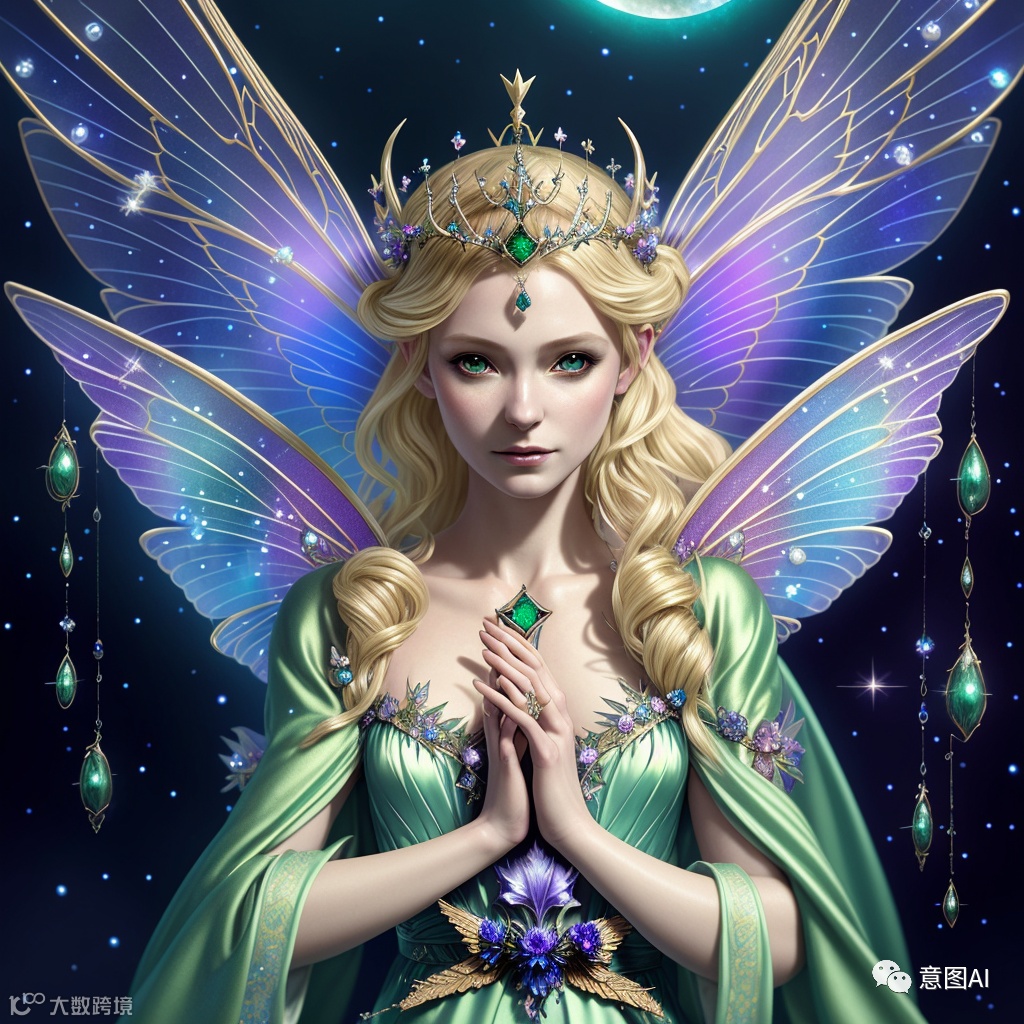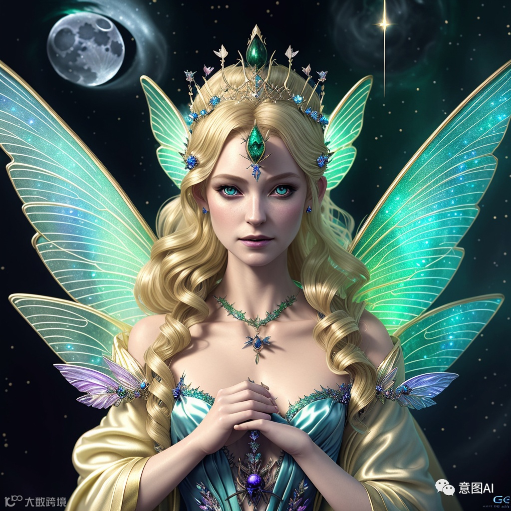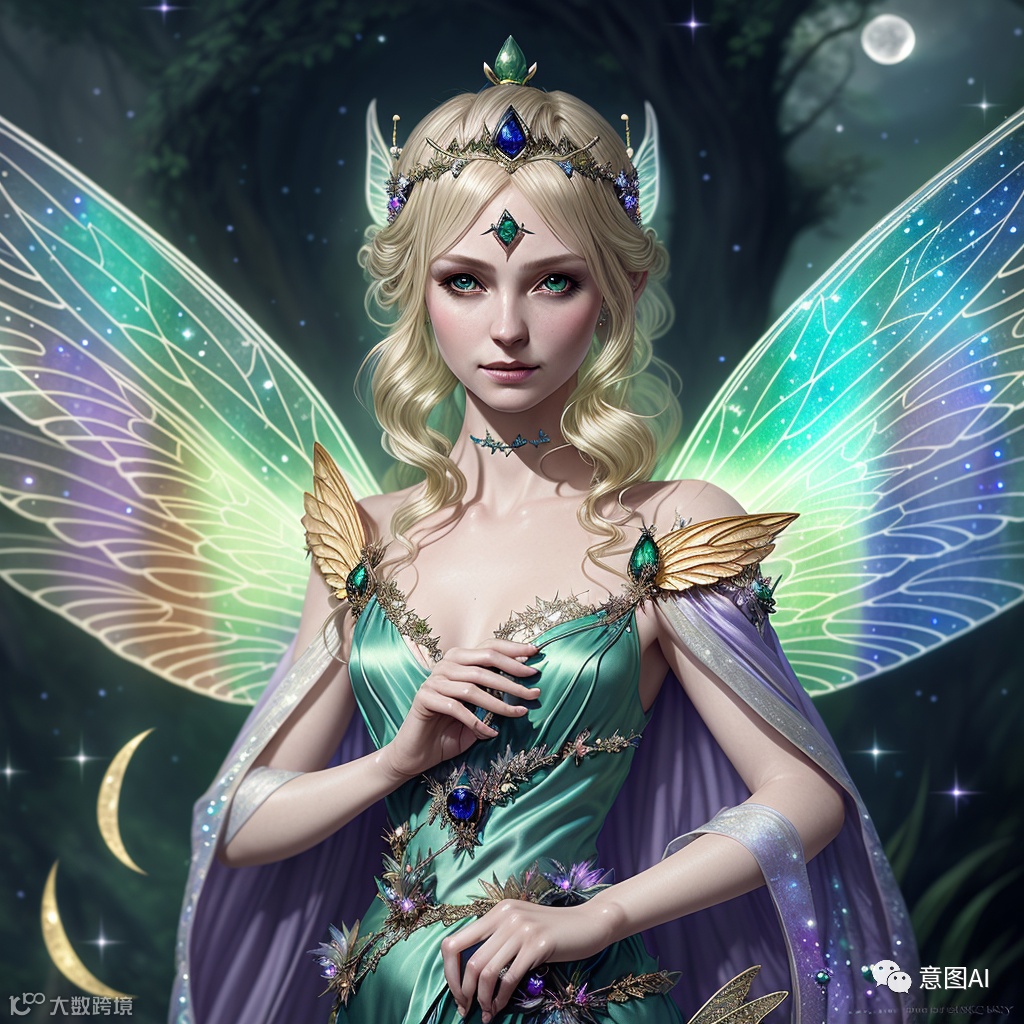 关键词:detailed portrait of a fairy queen with wings wearing a magic silk robe, pixie, iris, realism, emerald, galaxy, sapphire,blonde hair going down to the floor, moonlit, wearing a bejeweled mask, dark fantasy, dramatic lighting, cgsociety, artstation