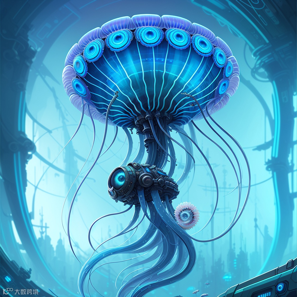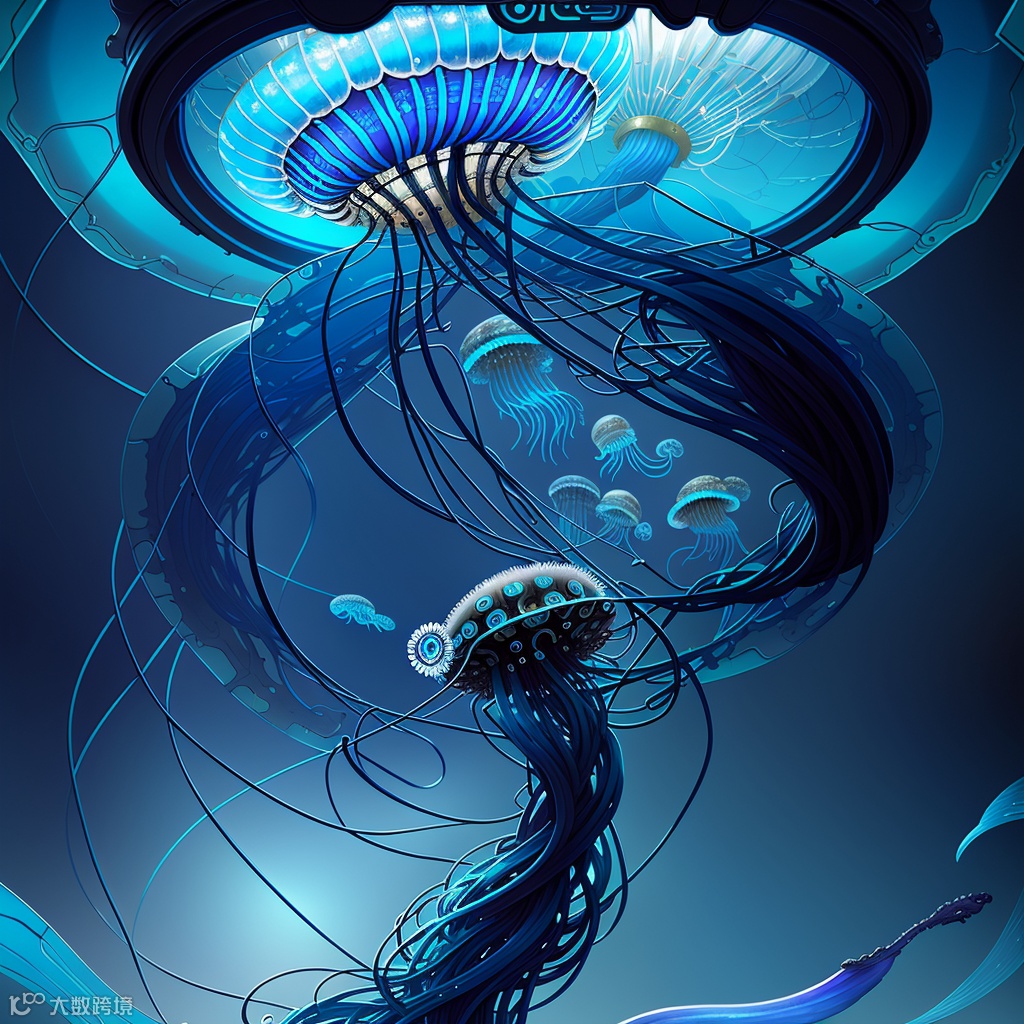 中文翻译:一个赛博朋克水母的全景超详细的绘画,蓝色音调,水下,8毫米,高度详细,数字式绘画,artstation,概念艺术,平滑,锐利的焦点,例证,艺术由artgerm和greg rutkowski和Alphonse Mucha W 2000