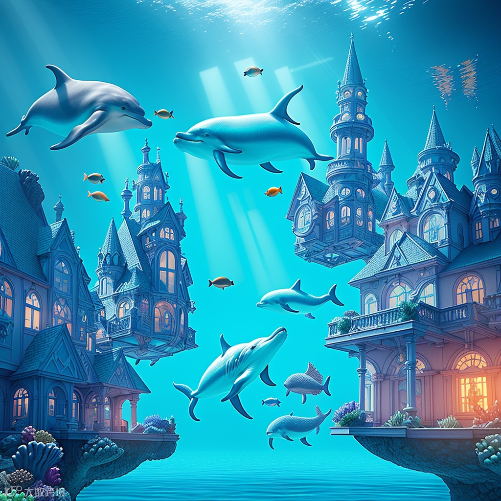 关键词咒语:fantasy underwater world with buildings, mermaids and fish, whales, dolphins, light rays coming from above through the water, hyperrealistic, 8K, octane render, rtx