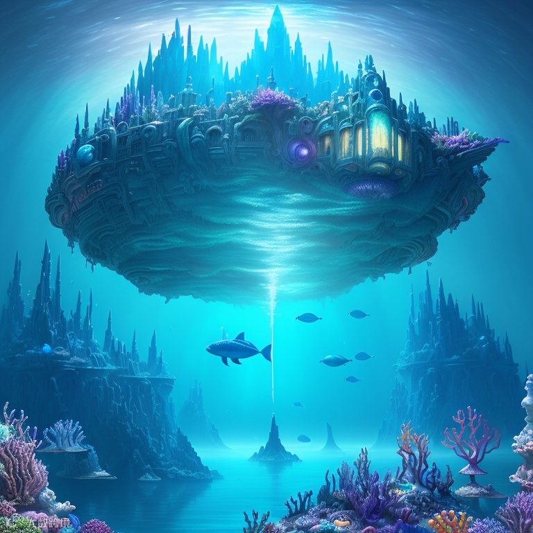中文翻译:一个超维幻想世界的绘画,一个海底世界,亚特兰蒂斯,科幻小说,上光,吉卜力工作室,虚幻引擎,史诗般的组成,CG数字渲染,超高清,技术高度详细,三元配色方案