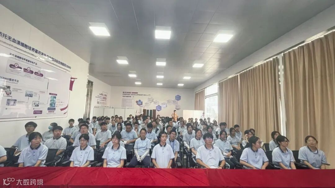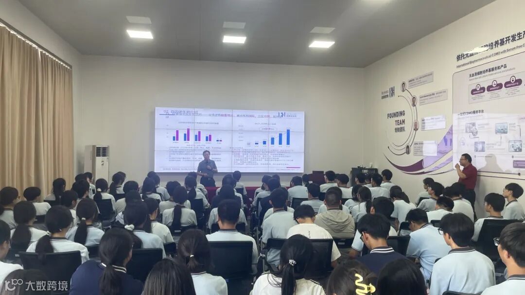 在一楼展厅,赵晓剑博士用通俗易懂的语言为同学们展开介绍,从公司成立的初心与发展历程,到一站式生物医药服务、外泌体、细胞培养基开发生产等核心业务,每一个故事、每一项技术都让同学们听得津津有味。赵晓剑博士提到,百因诺生物是一家以无血清培养基技术为核心驱动的国际化生物医药服务与外泌体产品开发企业,致力于为全球生物医药与美丽健康产业提供一站式、端到端解决方案,这些话语就像一颗种子,在同学们心中种下了对生物科技行业的向往。