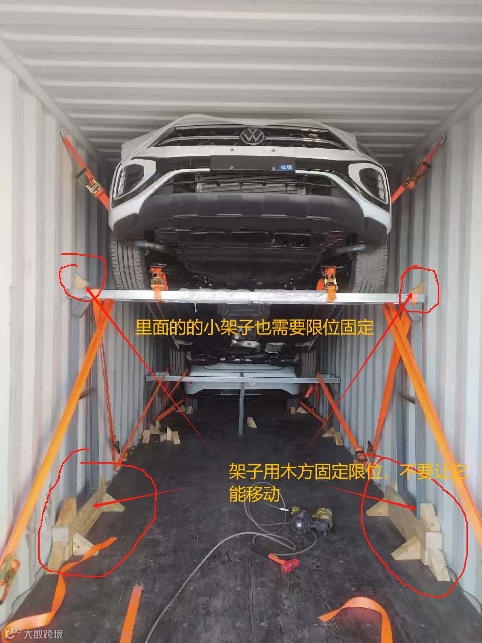 为了确保了16台SUV的安全运输在路上不受颠簸导致移位,我们需要对汽车进行加固。这包括激光测距仪辅助定位、三角木和绑带固定轮胎等多项措施。