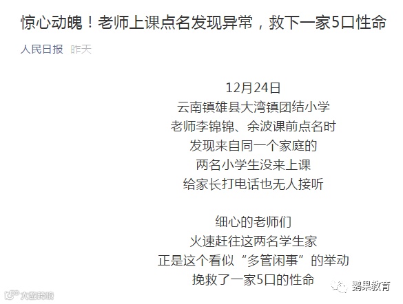 近日,人民日报发布了一则关于云南省镇雄县某小学发生的惊险事件,班主任在课堂点名中发现学生异常,正是老师的细心察觉,救下了一家5口性命。