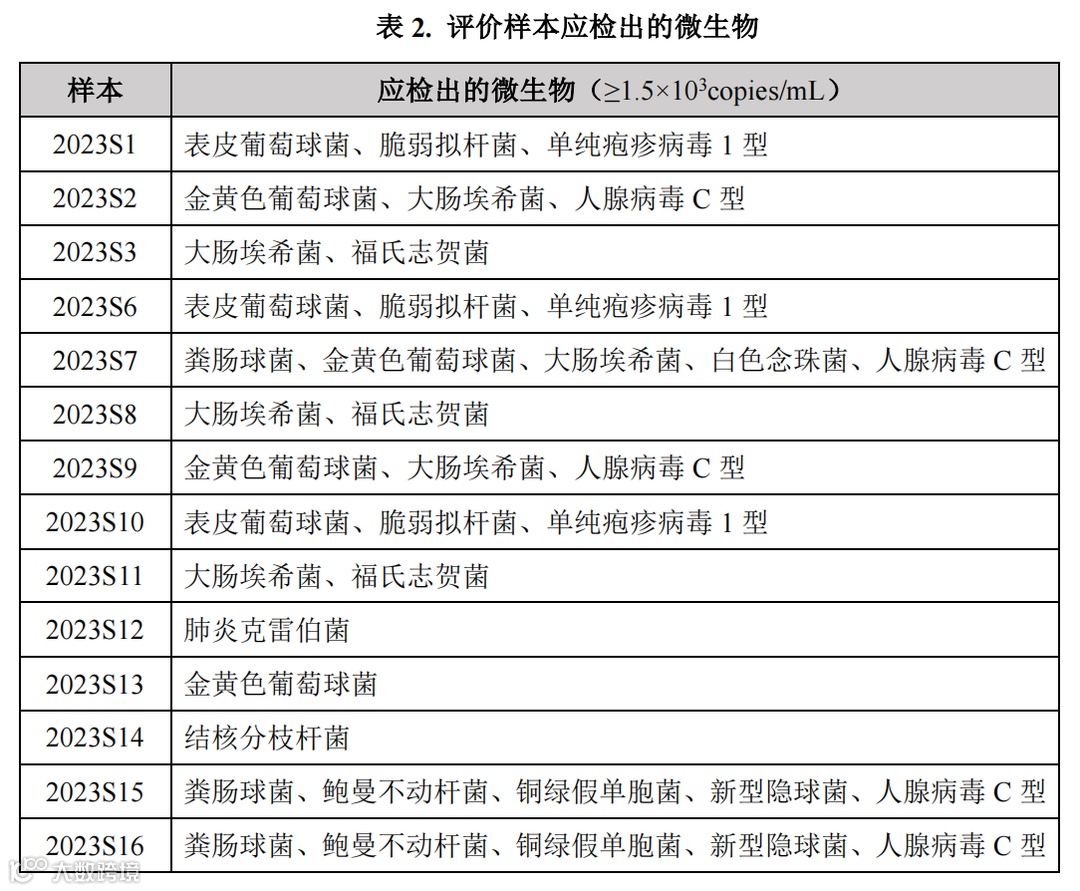 本次室间质评接受报名的实验室共146家,实际收到130家有效回报结果。活动评价原则包括假阳性结果、假阴性结果以及近缘菌株鉴定、报告解读等多个方面,诺因凭借自我研发的微量超敏技术及优异的mNGS全流程质量管理水平,满分通过此次室间质评。与公布标准答案进行比对分析,诺因对于低浓度样本(2023S5)能准确检出目标物种(表1),并对每个样本均能准确鉴定到种水平(表2),表明了诺因的检测产品具备高水平的特异性、敏感性及稳定性。参与此次活动,充分展示了诺因在病原体检测领域具备的技术实力和高质量水平。