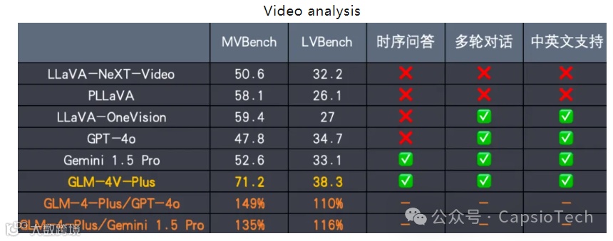 图像/视频理解模型GLM-4V-Plus:不仅在图像理解方面表现出色,还具备基于时间序列分析的视频理解能力。该模型即将在开放平台bigmodel.cn上线,并成为国内首个通用的视频理解模型API。
