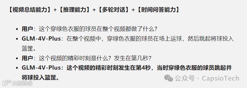 比如,你给它一段这样的视频,并询问它穿绿色衣服的球员在整个视频都做了什么?它可以精准地描述球员的球员所做的动作,还能准确地告诉你视频的精彩时刻在第几秒: