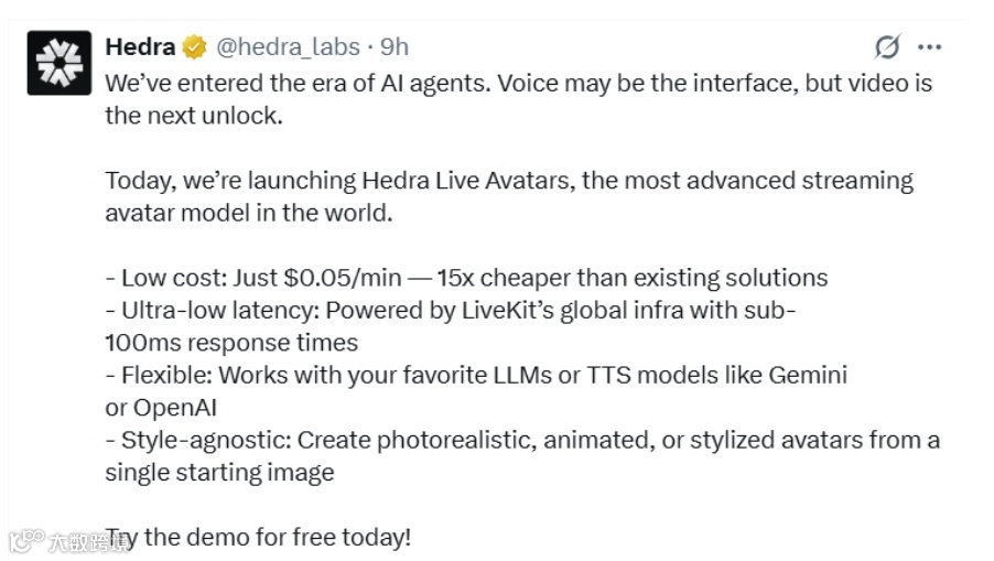 Hedra实验室推出革命性的流媒体头像模型——Hedra Live Avatars。该技术凭借显著优势,为内容创作、教育、营销等领域开启了低成本、高实时的视频AI代理新纪元。