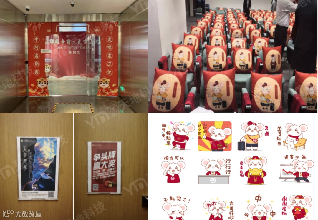 二是做足IP氛围文化,用无处不在的宣传载体进行潜移默化的文化传播。将品牌IP广泛应用于三个方面:一是在厅堂氛围打造上,展示在厅堂的展板、门贴、地贴、活动易拉宝,让支行网点全方位感知品牌IP;二是在行内氛围打造上,用开门红靠枕、宣传板、吊旗、卫生间海报等方式营造文化气息,线上宣传涵盖产品手册、行动指南,让员工在学习业务知识的过程中潜移默化感受文化输出,便于员工理解活动内容;三是品牌文创方面,设计精美微信表情包、红包封面,为员工与客户之间的日常交流增添更多温度。