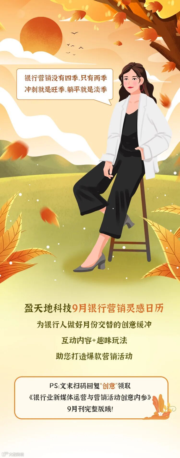 盼望着,盼望着,9月来了,中秋小长假的脚步近了!9月话题点主要来自开学季、教师节、中秋节、九一八纪念日、白露、秋分、世界骑行日等,银行可围绕感恩教师节、中秋庆团圆、弘扬主旋律、秋风送爽季四个方向展开金融类主题活动营销与品牌推广。
