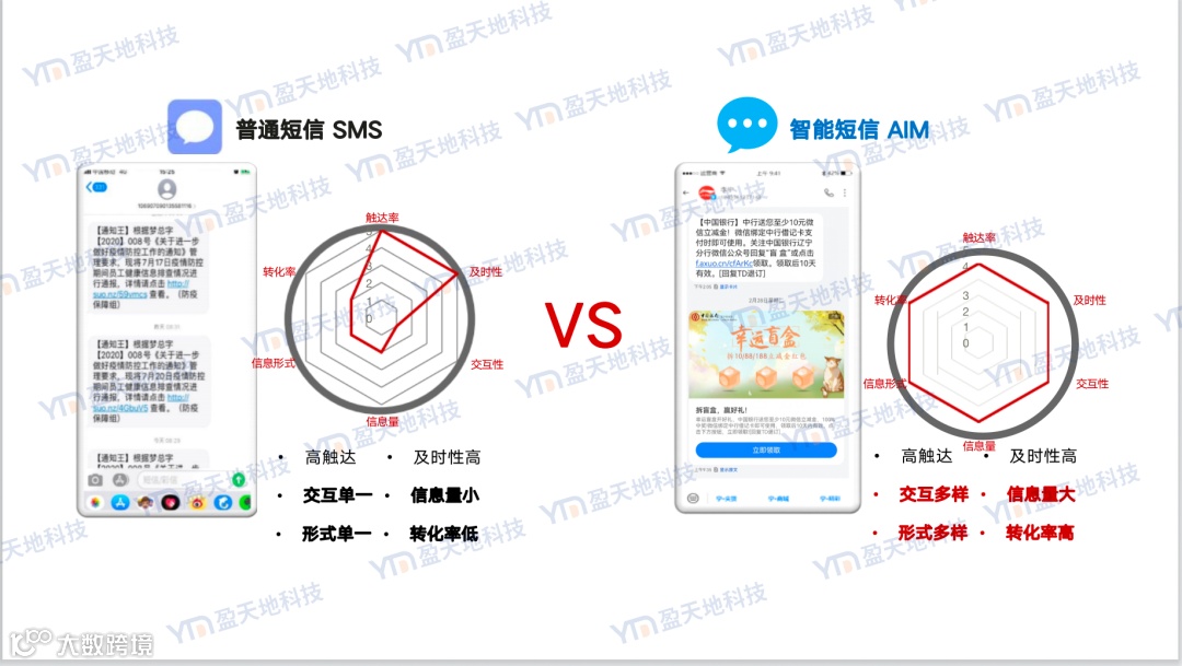 目前营销短信仍是银行众多触客渠道当中较为重要的一个,但是受限于传统短信服务内容单一、信息量小、交互单一、形式单一、易被拦截等弊端,触达率和点击率较低,无法有效满足数字时代大众不断增长的金融和非金融服务要求。