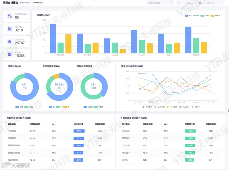 数据质量管理模块的功能为:基于采集的元数据,将元数据与数据标准对标生成数据质量规则,并根据质量规则对全行数据进行定期或者手动的数据质检,并针对发现的质量问题启动问题整改流程。主要包含: