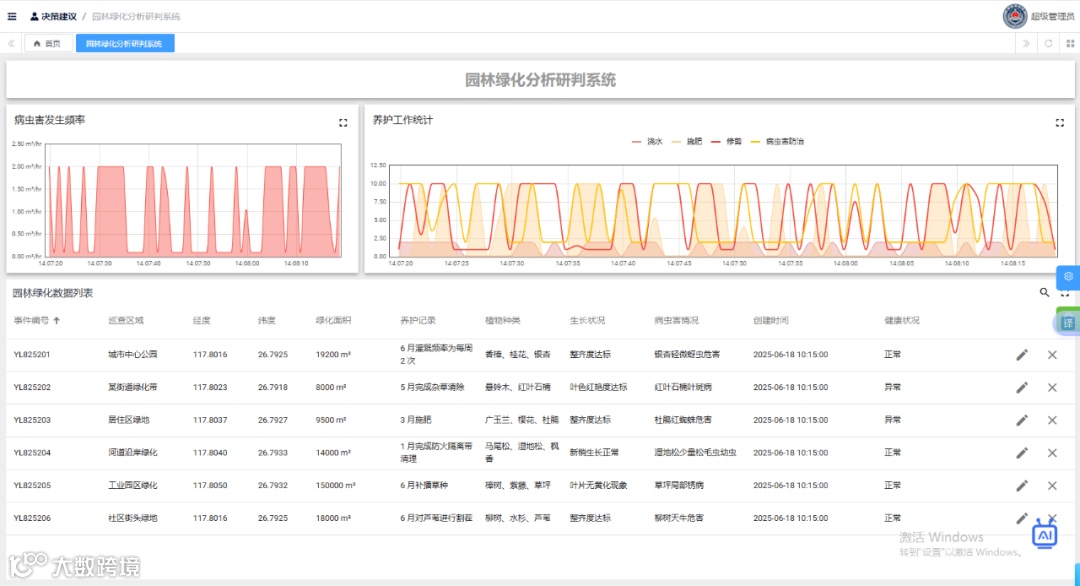 系统提供丰富的可视化手段,地图展示基于GIS技术,实现绿化设施空间分布与状态的直观呈现;图表展示组件支持柱状图、折线图、饼图等多种形式,满足不同分析场景需求;仪表盘通过关键指标卡片式布局,为管理者提供一站式数据概览。