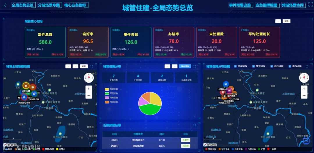 :全域数据地图、核心指标(事件总数 / 处置率 / 预警数)、设施分布; - 分域专题