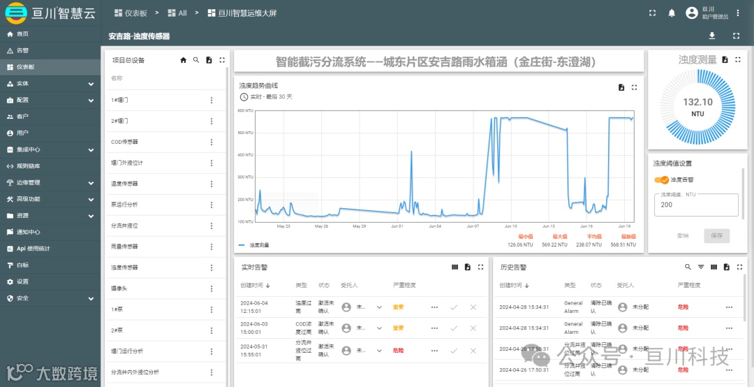 借助亘川智慧云平台,以更加直观的方式,全面展现浊度传感器的运行状态,从而为用户提供更加清晰、准确的监控与管理体验。