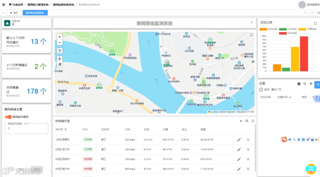 整合管网系统的各类数据,包括流量、压力、水质、阀门状态等。在仪表板上以直观的图表形式实时呈现这些数据,展示数据的动态变化;对管网关键指标进行实时监测,如流量异常、压力过高或过低、水质超标等;一旦出现异常情况,立即发出预警信号,以醒目的方式在仪表板上显示。