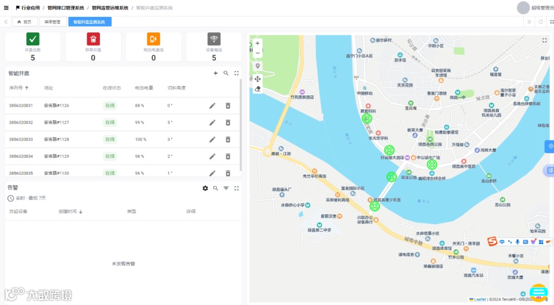 实时呈现各个智能井盖的状态信息,包括位置、开启/ 关闭状态、倾斜角度等;以直观的图表形式展示井盖状态数据随时间的变化趋势;当井盖出现异常情况,如被非法开启、倾斜角度过大、位移等,立即发出报警信号。