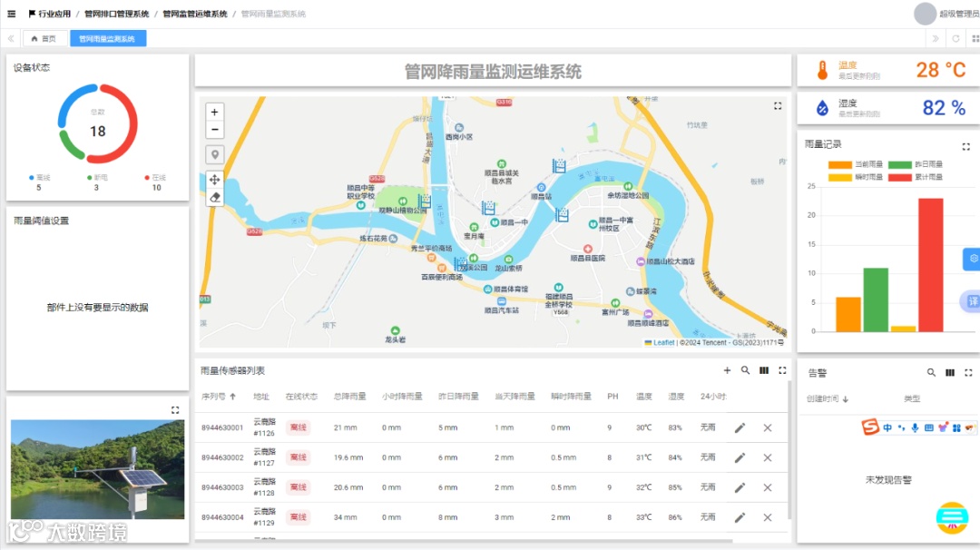 实时呈现管网各监测点的雨量数据;以图表形式展示雨量随时间的变化趋势,如折线图、柱状图等。设定雨量预警阈值,当雨量超过阈值时发出预警信号。